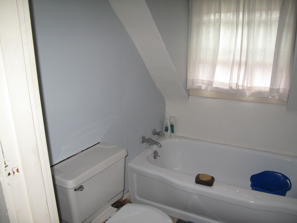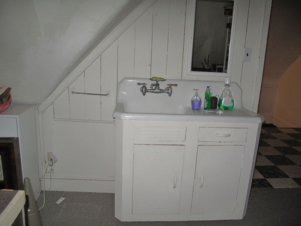 bathRight now, the third floor is broken up into three rooms that are accessed off a small landing, plus a full bath…sort of. The toilet and tub are tucked into the front of the house under the eaves of the front window. The sink, however, is around the corner in what I call “the room where things go to die.” So the sink sinkaccessplumbing backs up to all the other plumbing, and I can’t figure out even to where I would move it if I felt like getting out the pipe wrench.