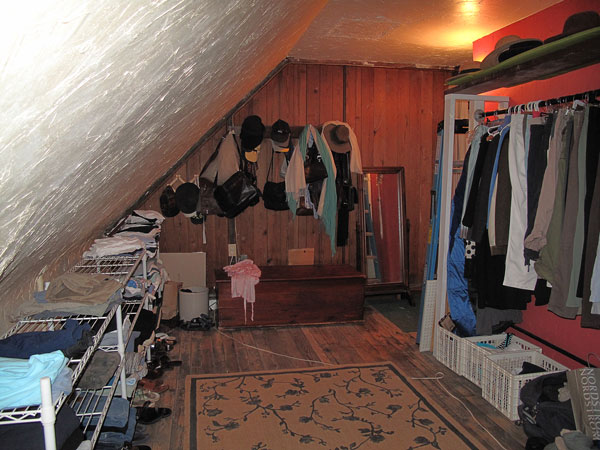 closetAlongside the guest room is my crazy-big walk-in closet (and no, you needn’t comment on the fact that I’ve too many clothes, thanks). The front of the closet is divided from the “sink room” (a.k.a. where things go to die) by simple slats – those could easily be removed to make the front room larger, which could then possibly be reconfigured into a bedroom while also carving out a little extra space for the bath.