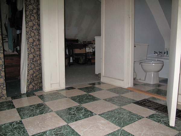 landingSo here are my thoughts – keeping in mind that I don’t know how to do some of this stuff. Looking again at the landing (left). I’m thinking I can remove the return (and install three of these nifty wall HVAC units instead, one in each room), then move the bathroom wall out to where the right edge of the closet door is now, and push the bathroom door as far to the right as possible. That would give me 40″ square in which to install a small shower alongside the toilet, and a sink could go just inside the door. Of course, to do that, I’d have to rip up the floor to run the plumbing, but I wouldn’t miss the peel-n-stick vinyl. I’d also have to learn how to reroute plumbing. Then there’s the backer board, drywall and a lot of tiling. (I actually like installing tile; what I hate is grouting.)