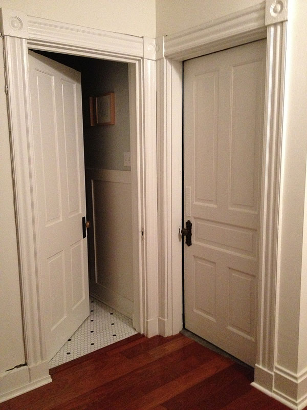 So of course, now that the house is off the market and no one will notice or care, I decided to rehang it on the inside of the jamb so that it opens in.