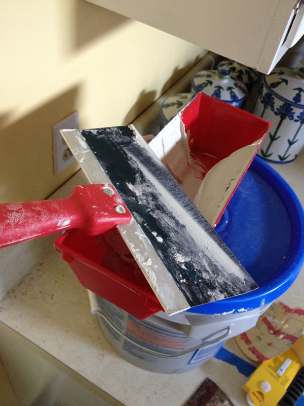 troughI came to a screeching stop on the tile work, then had to scurry to patch and paint the plaster (and the exposed “wood” on the cabinet against which the removed one had hung). Oh – and there was a massive pile of towels, bath mats and sheets to wash because I’ve just said goodbye to the  house guests I’d had for almost a week.