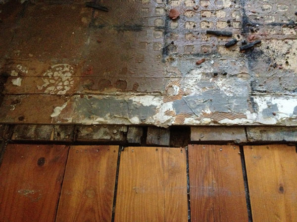 Unfortunately, I can’t yet tell just how horrid the horrors are; there’s too much residue from the 30-year old (or more) rosin paper (which may actually be tar paper – rat bastards) sticking to the wood. I took a few desultory swipes at it with an old putty knife, but some chunks of wood came up with a few of my exploratory passes (flat-sawn lumber…not the best choice for flooring).