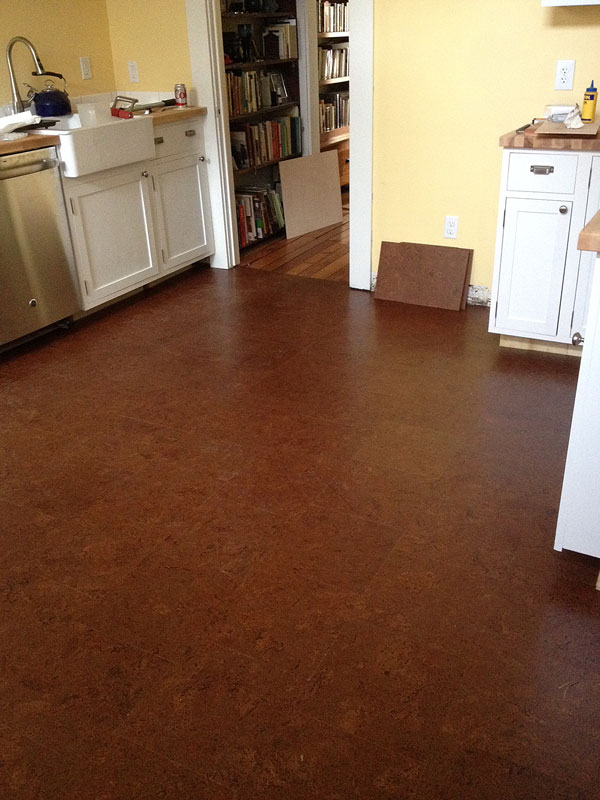 Last night, after completing various neighborhood pet-sitting duties and setting the backsplash tiles, I decided to get over my first-timer’s fear and start in on the cork tiles. That was at 10 p.m. I got as far as you see above by about 1 a.m., and called it a night.