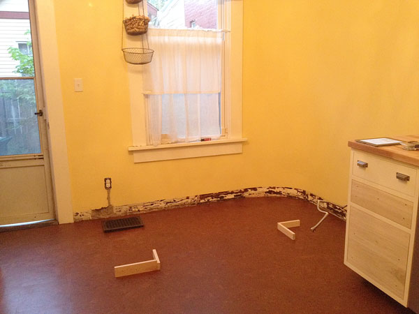 There’s still a minor wall repair to make where my neighbor moved an outlet up above the baseboard line (thank you neighbor…I just didn’t have the time), baseboards to run and install (including a kerf bend around the curve), a countertop-height table with a curved top to fit in to the left of the stove (I hate that curve), three drawers still to paint and their hardware to install, the backsplash tile to grout and a kitchen island to make. It’s that last one that has me thinking Ikea. I can only assume it’s the alcohol talking. I might just listen.