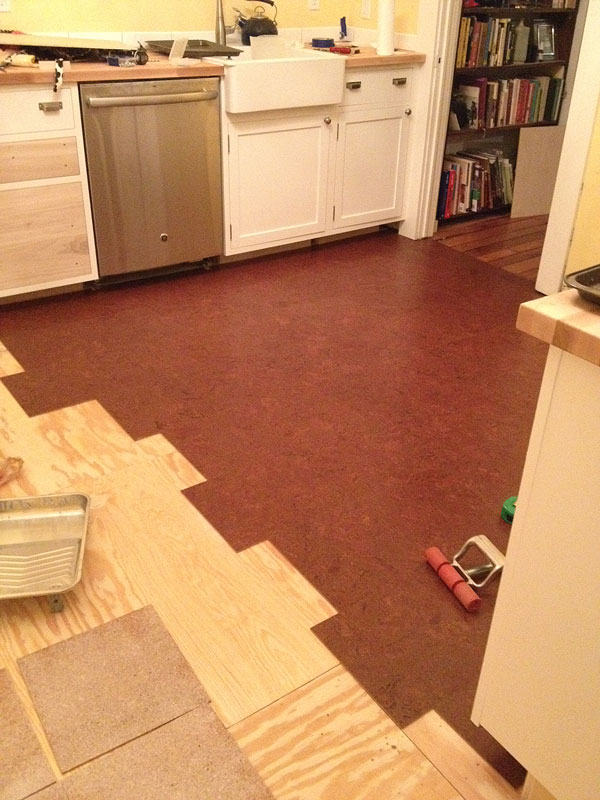 Cork is also pretty easy to install. The adhesive I used has a three-hour open time (if you coat the floor and the tiles at around the same time; if you pre-coat the tiles, the working time drops to an hour with the floor’s adhesive). I rolled the stuff on both (working with about 12-15 tiles at a time, and coating the appropriate area of underlayment), waited for it to turn clear(ish) and dry to the touch, then defended the prep against cats while the adhesive flashed. Then, it was just a matter of aligning the first one with the chalk lines I’d dropped near the sink, and working my way out, pounding each in place with a rubber mallet. Each row is staggered 3-1/2″ from the previous one. (No real reason other than it looked good to select 3-1/2″.) After every 12-square-feet or so, I used a J-roller on the joint lines.
