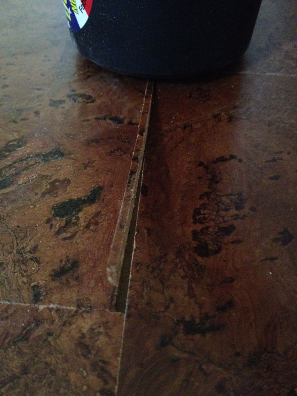 It also came in handy in helping me to fix a wee problem. Somehow, I got a little off on a few tiles, which resulted in having to fill narrow gaps in a few places at the staggered joints. On the table saw, I was able to rip 1/16″-wide strips off the springy cork (I backed it with 1/4″ ply so I didn’t lose the tiny offcut), and tap them down into place. It’s rather like string inlay – with the notable exception that I don’t want the strips to stand out. And they don’t. After two coats of waterborne poly (Bona “Traffic”), they’ll not show even less.