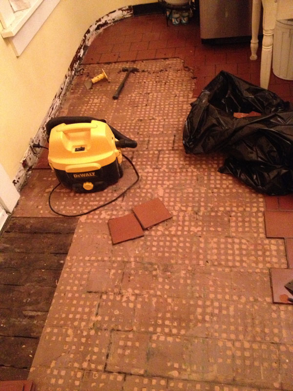 Tile tear-out, then underlayment tear-out. That was a bear.