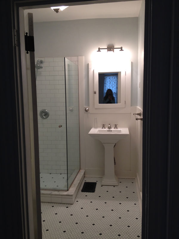 The first room I redid in the house. I was delighted to see the end of the 1980s brown tile and plastic tub.