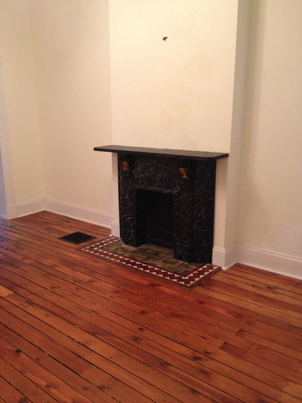 The fireplace looks forlorn without its massive flanking Shaker pieces.
