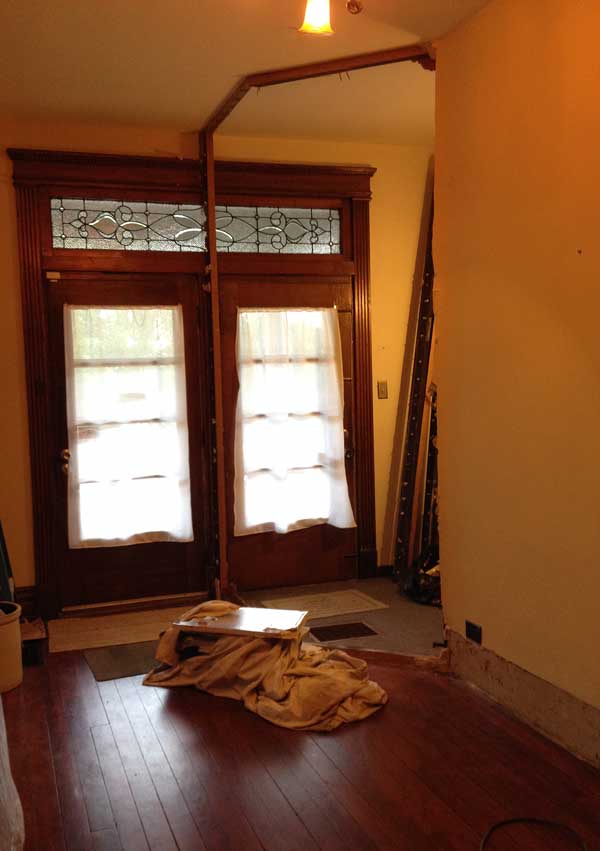 But it’s worth it. Already, with only the bottom area torn out, the entryway is much more inviting (if one can overlook the dust), and a lot brighter, too. I still have plenty of the plaster-like stuff to remove to fully open up the stairwell, and there’s some pretty nasty carpet to tear out (and under that, Masonite). So I don’t yet know the state of the trim on the bottom edge of the staircase (if it’s even there) or if the original treads are still in place (and/or salvageable).