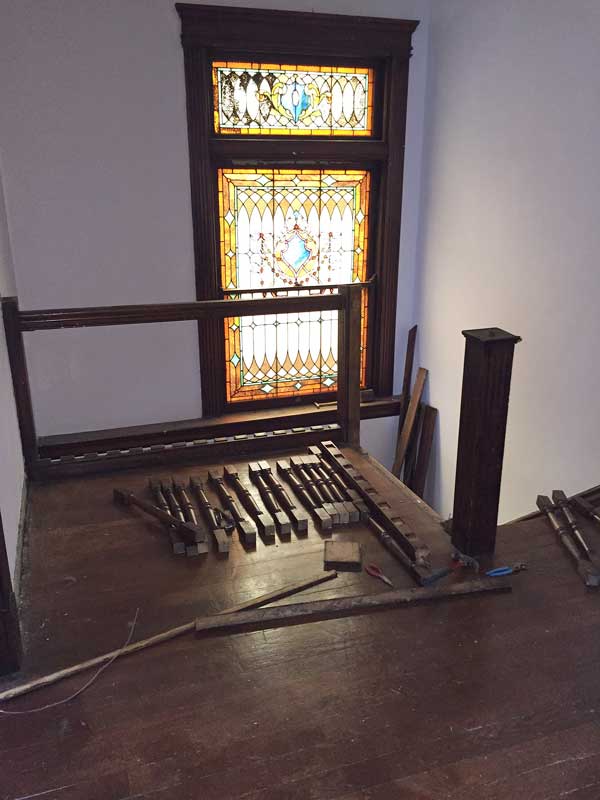 My sis had a house in Oakley, same layout, same stained glass window, same history of being chopped into small units… same floor existed that you are removing. As her family grew, she re-did the kitchen and moved to bigger digs nearby. Never attacked this re-model project – but the view of the stained glass window looks great!