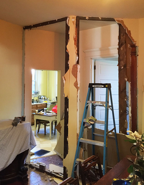 With that wall down, it becomes more obvious that either the door to the kitchen is also not original, or that it was blocked in and made shorter and narrower at some point…but why? My best guess is that what is now the bathroom was a butler’s pantry that connected the kitchen and dining room (there are still a couple intact butler’s pantries in houses in my ‘hood of the same vintage and basic design). You can see in the bathroom wall that a doorway to the kitchen has been filled in.