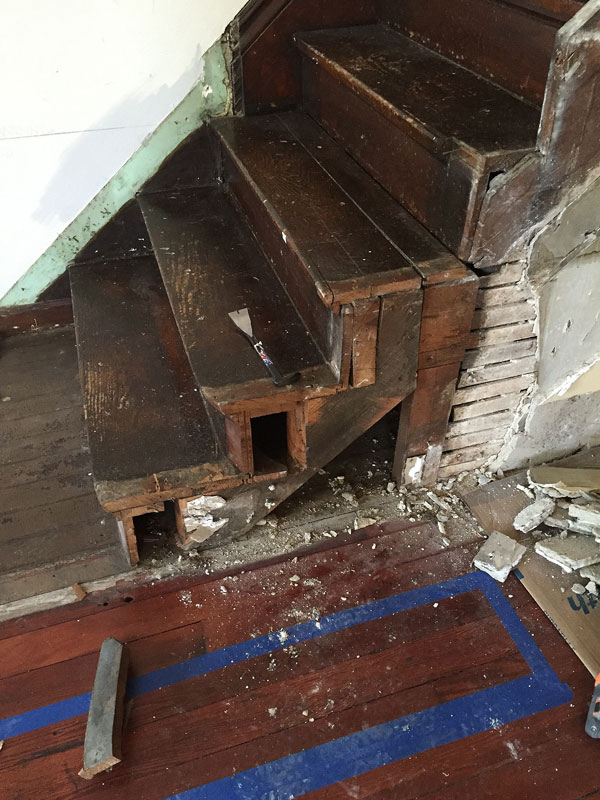 Clearly, the above is cobbled together, with what appears to be the original stringer serving the same purpose here, though not at all properly. The risers, of course, should be flush with the L-shapes in the stringer. If you look closely, you can see the chiseled curve on the stringer that matches the curve of the second riser…and that the full sweep of the curve on the tread and riser have been cut off (dammit) to fit into the wall that formerly blocked in the staircase.