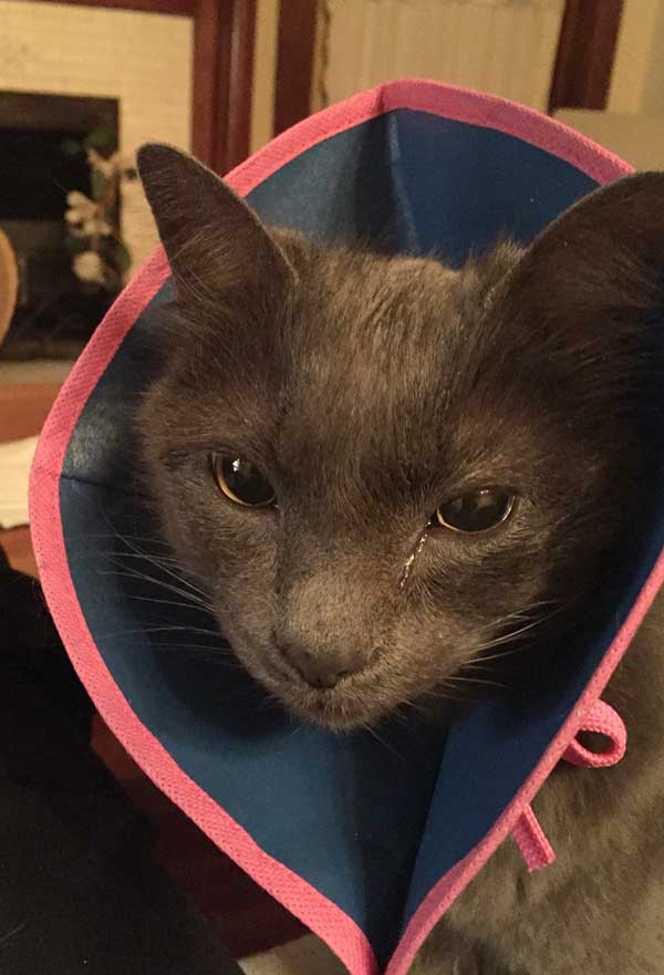 At least the kitty’s Cone of Shame looks comfy and fashionable.