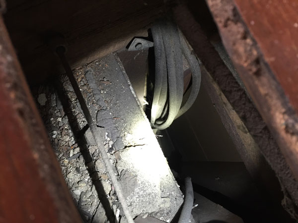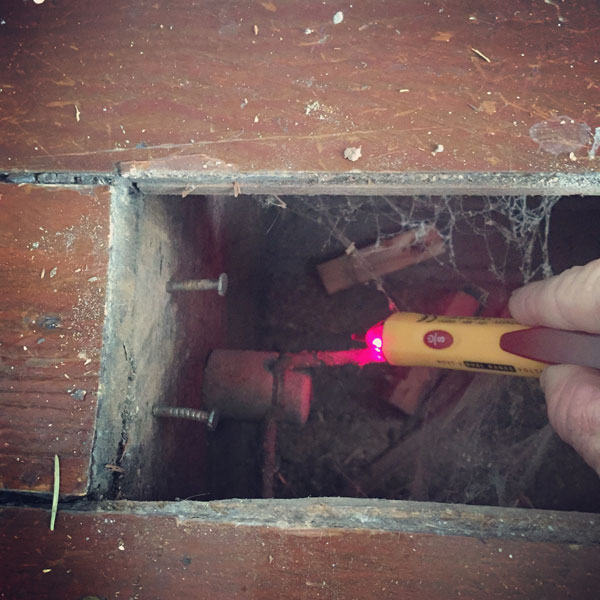 It seems that hack might have lived a lot longer ago than I thought; there’s still live knob and tube in the floors. Or the hack left the knob and tube and simply added some new wiring, because there is also some abandoned knob and tube, and a hydra-like collection of circa 1950s Romex. There are also a lot a cobwebs.