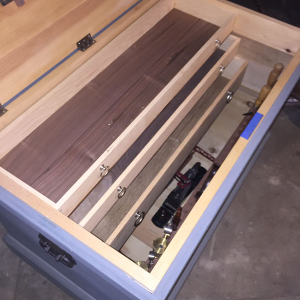 Instead of fitting the tills tight to the chest walls as Christopher Schwarz directs in “The Anarchist’s Tool Chest” (I really don’t think I could have done that easily with no feeling in several fingers) I used a trick he mentioned in a blog well after the book was published – the tills are a bit undersized from left to right (particularly the middle one; my stop slipped), but the bottoms are snug (thank you shooting plane).