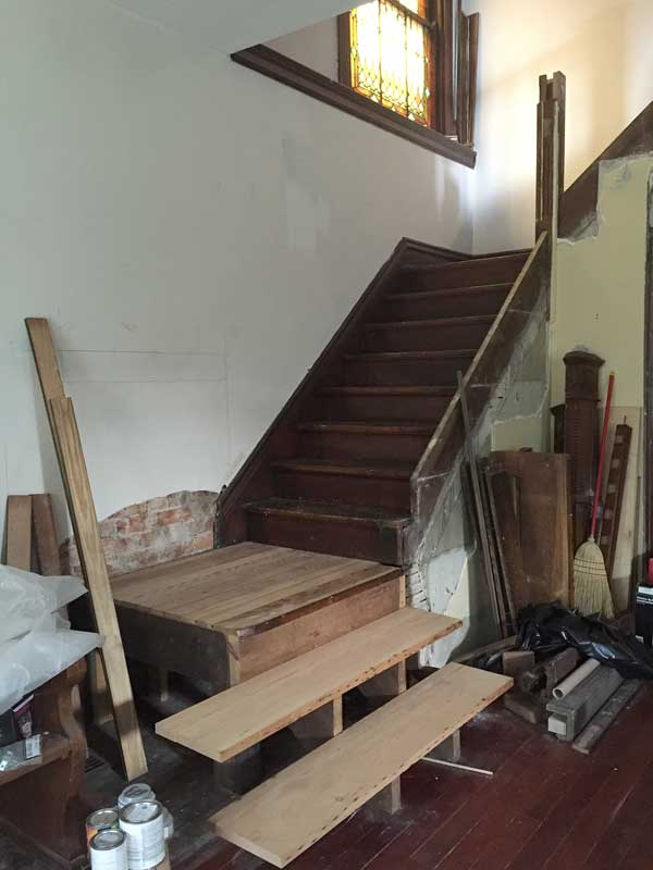 All I’ve really done (that’s worthwhile) on the stairs in the last month is to take one of the original 1-1/4″-thick bottom treads (that had been cut short in the 1950s, precluding its reuse as a tread in my “new” configuration) rip it to 5″-wide or so then cut a wide, 1/2″-deep rabbet on the back to use as the front 3/4″-thick floorboard on the landing, with the original profiled edge lipped over the front. (I have the original 3/4″-wide moulding that will butt underneath it. Eventually.)